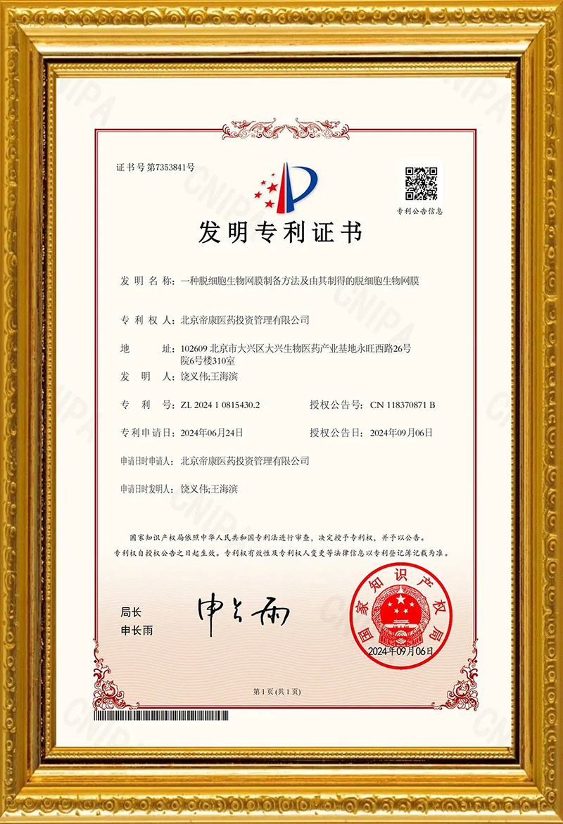 2024年9月6日,國家知識產權局批準了北京帝康醫藥投資管理有限公司d-ECM脫細胞基質原料的新的發明專利授權,專利名稱為“一種脫細胞生物網膜制備方法及由其制得的脫細胞生物網膜”(專利號:ZL 2024 1 0815430.2)。