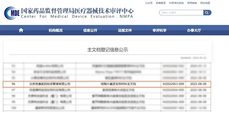此前,在國家藥品監督管理局醫療器械技術審評中心公布的最新的《主文檔登記信息公示》文檔中,北京帝康醫藥投資管理有限公司的脫細胞基質生物材料也已通過主文檔登記備案,原材料基于承擔的國家“十三五”重點研發計劃“低免疫原性膠原、絲素蛋白工程化制備技術及其產品研發”(SQ2017YFSF100202)研發落地的成果,主文檔備案的通過具有重要里程碑意義,為醫藥行業脫細胞基質相關產品研發及生產提供了合法來源的原料。