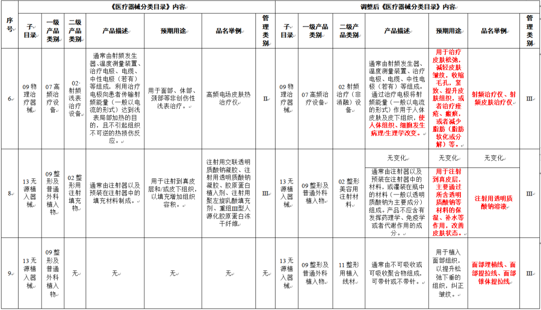 △《醫療器械分類目錄》部分內容調整表對部分醫美產品監管類別做出調整(來源:醫療器械標準管理中心)