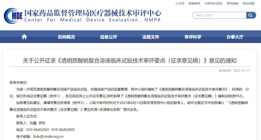 ▲《透明質酸鈉復合溶液臨床試驗技術審評要點(征求意見稿)》(來源:器審中心)
