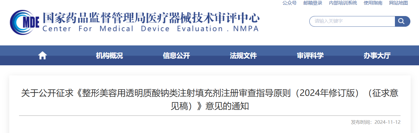 根據國家藥品監督管理局醫療器械注冊技術指導原則制修訂計劃的有關要求,中心組織對2016年制定的《透明質酸鈉類面部注射填充材料注冊技術審查指導原則》開展修訂工作,形成了《整形美容用透明質酸鈉類注射填充劑注冊審查指導原則(2024年修訂版)(征求意見稿)》,現向社會公開征求意見。