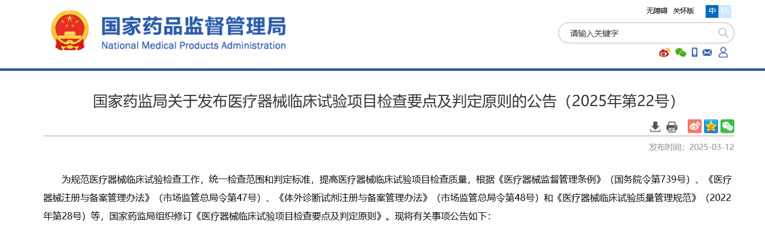 為規(guī)范醫(yī)療器械臨床試驗(yàn)檢查工作,統(tǒng)一檢查范圍和判定標(biāo)準(zhǔn),提高醫(yī)療器械臨床試驗(yàn)項(xiàng)目檢查質(zhì)量,根據(jù)《醫(yī)療器械監(jiān)督管理?xiàng)l例》(國(guó)務(wù)院令第739號(hào))、《醫(yī)療器械注冊(cè)與備案管理辦法》(市場(chǎng)監(jiān)管總局令第47號(hào))、《體外診斷試劑注冊(cè)與備案管理辦法》(市場(chǎng)監(jiān)管總局令第48號(hào))和《醫(yī)療器械臨床試驗(yàn)質(zhì)量管理規(guī)范》(2022年第28號(hào))等,國(guó)家藥監(jiān)局組織修訂《醫(yī)療器械臨床試驗(yàn)項(xiàng)目檢查要點(diǎn)及判定原則》。現(xiàn)將有關(guān)事項(xiàng)公告如下: