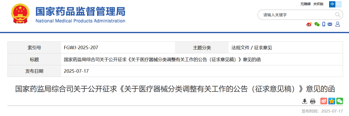 為進一步優化醫療器械分類目錄動態調整工作,強化分類調整后注冊備案相關工作,國家藥監局組織對《醫療器械分類目錄動態調整工作程序》進行修訂,在此基礎上,起草了《關于醫療器械分類調整有關工作的公告(征求意見稿)》(附件1),現向社會公開征求意見。 公開征求意見時間是2025年7月17日—8月16日,請于2025年8月17日前將反饋意見表(附件2)反饋至電子郵箱tws-xbs@nifdc.org.cn,電子郵件標題請注明“醫療器械分類調整反饋意見”。 附件:1.關于醫療器械分類調整有關工作的公告(征求意見稿) 國家藥監局綜合司 2025年7月15日 為加強醫療器械分類管理,依據《醫療器械監督管理條例》《醫療器械注冊與備案管理辦法》《體外診斷試劑注冊與備案管理辦法》,根據醫療器械風險程度,國家藥監局可以通過調整《醫療器械分類目錄》《第一類醫療器械產品目錄》《體外診斷試劑分類目錄》,或者發布文件,進一步明確或調整醫療器械(含體外診斷試劑,下同)產品管理屬性和管理類別。為進一步優化有關工作要求,國家藥監局組織修訂了《醫療器械分類目錄動態調整工作程序》,并明確了分類調整后注冊備案相關工作要求。現將有關工作要求公告如下: 一、醫療器械管理類別調整后注冊備案有關要求 (一)在相關文件規定的管理類別調整之日前批準的醫療器械注冊證,原醫療器械注冊證在有效期內繼續有效。 (二)自管理類別調整之日起,對于首次提出注冊申請的醫療器械,應當按照調整后的類別受理產品注冊申請。 對于管理類別調整之日前已受理首次注冊申請但尚未作出審批決定的,藥品監督管理部門可以按照原管理類別繼續審評審批;準予注冊的,在注冊證備注欄中注明調整后的管理類別,其中,對于管理類別調整文件規定了注冊過渡期的,還應當限定醫療器械注冊證有效期不得超過相關文件規定的注冊過渡期截止之日。 (三)對于管理類別調整之日前已受理但尚未作出審批決定的延續注冊申請項目,藥品監督管理部門按照原管理類別繼續審評審批;準予延續注冊的,在注冊證備注欄中注明調整后的產品管理類別,其中,對于管理類別調整文件規定了注冊過渡期的,還應當限定醫療器械注冊證有效期不得超過相關文件規定的注冊過渡期截止之日。 對于在管理類別調整之日前批準的醫療器械注冊證,如涉及產品管理類別由高類別調整為低類別的,注冊人應當按照改變后的類別向相應藥品監督管理部門申請延續注冊或者辦理備案。藥品監督管理部門對準予延續注冊的,按照《分類目錄》核發醫療器械注冊證,并在注冊證備注欄中注明原醫療器械注冊證編號;對備案資料符合要求的,辦理備案,并在備案信息表備注欄中注明原醫療器械注冊證編號。 對于在管理類別調整之日前批準的醫療器械注冊證,如涉及產品管理類別由低類別調整為高類別的,注冊人應當按照改變后的類別向相應藥品監督管理部門申請注冊。在原醫療器械注冊證有效期內按調整后的高類別提出注冊申請的,如原醫療器械注冊證在管理類別調整文件規定的注冊過渡期截止之日(如有)前到期的,在產品安全有效且上市后未發生嚴重不良事件或質量事故的前提下,注冊人可按照原管理類別向原注冊部門提出延續注冊申請,準予延續注冊的,醫療器械注冊證有效期不得超過管理類別調整文件規定的注冊過渡期截止之日。 (四)在管理類別調整之日前批準的醫療器械注冊證,在醫療器械注冊證有效期內產品發生《醫療器械注冊與備案管理辦法》第七十九條或者《體外診斷試劑注冊與備案管理辦法》第七十八條所規定的變化,需要變更注冊或者備案的,注冊人應當向原注冊部門申請變更注冊或者辦理備案。藥品監督管理部門對準予變更注冊或者備案的,核發醫療器械變更注冊或變更備案文件,并在備注欄中注明調整后的產品管理類別。 (五)對于管理類別調整為第一類醫療器械的,自管理類別調整之日起,應當按照調整后的類別辦理產品的第一類醫療器械備案。 管理類別由第一類醫療器械調整為高類別的產品,對于管理類別調整之日前已辦理第一類醫療器械備案的,備案人應當按照改變后的類別向相應藥品監督管理部門申請注冊,并主動取消原第一類醫療器械備案。自管理類別調整文件規定的注冊過渡期截止之日(如有)仍未主動取消備案的,可由原備案部門公告取消備案。 對于管理類別調整之日前已辦理第一類醫療器械備案的,自管理類別調整文件規定的注冊過渡期截止之日(如有)前,備案信息表中登載內容及備案的產品技術要求發生變化,需要變更備案的,備案人應當向原備案部門變更備案,并提交變化情況的說明以及相關文件,藥品監督管理部門應當將變更情況登載于備案信息中。 (六)自管理類別調整文件規定的注冊/備案過渡期截止之日(如有)起,未依法取得醫療器械注冊證或者辦理第一類醫療器械產品備案的,不得生產、進口和銷售。 二、由不作為醫療器械管理調整為按照醫療器械管理產品有關要求 對于原不作為醫療器械管理、調整為作為醫療器械管理的產品,注冊申請人或備案人應當向相應藥品監督管理部門申請醫療器械產品注冊或者辦理第一類醫療器械產品備案;自相關文件規定的注冊/備案過渡期截止之日(如有)起未依法取得醫療器械注冊證或者辦理第一類醫療器械產品備案的,不得生產、進口和銷售